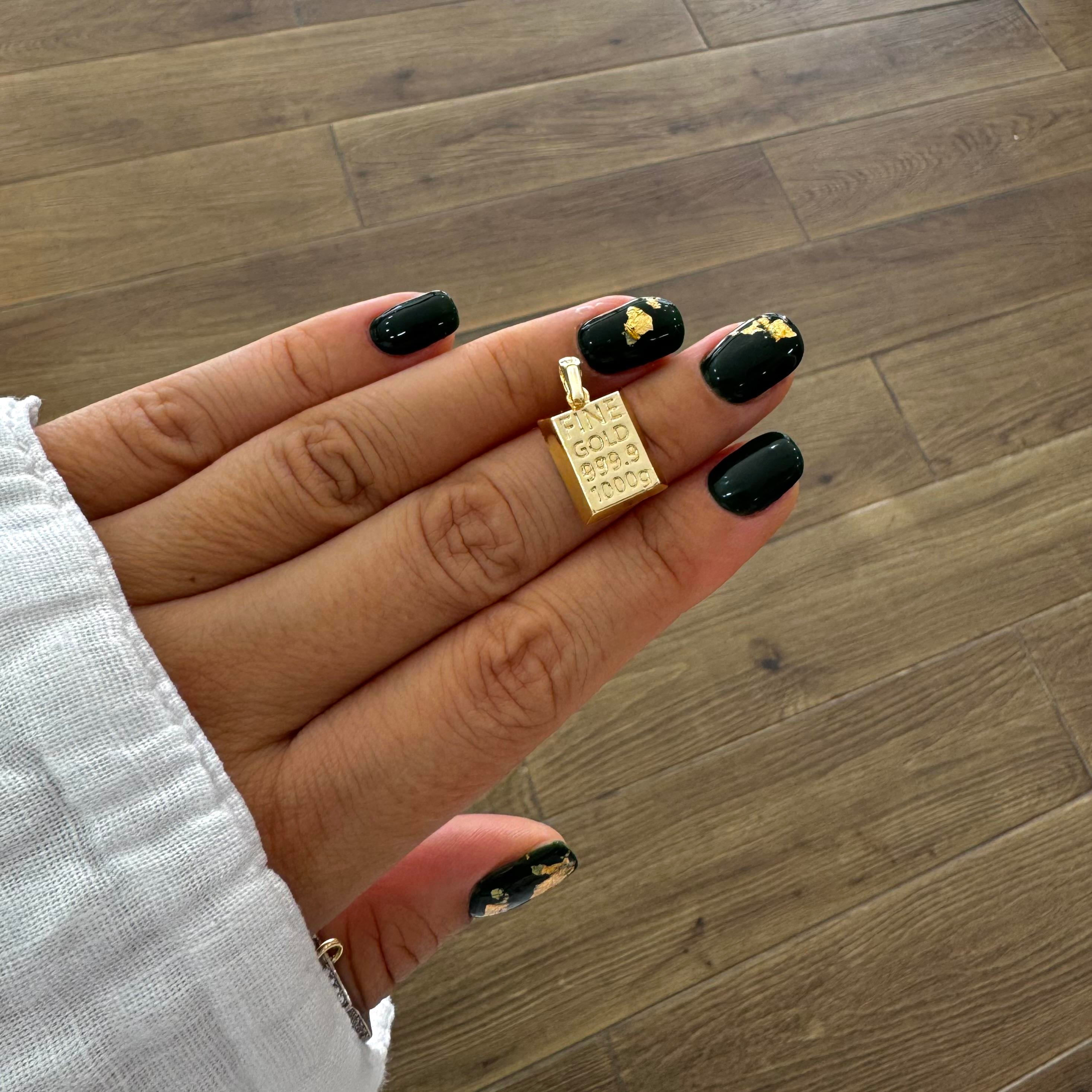 Güç ve zenginliğin simgesi külçe altın formu, modern bir tasarımla buluştu. Minimal detaylarıyla stilinize ışıltı katacak bu özel kolye ucu, günlük kombinlerden özel davetlere kadar her anınıza eşlik edecek.
