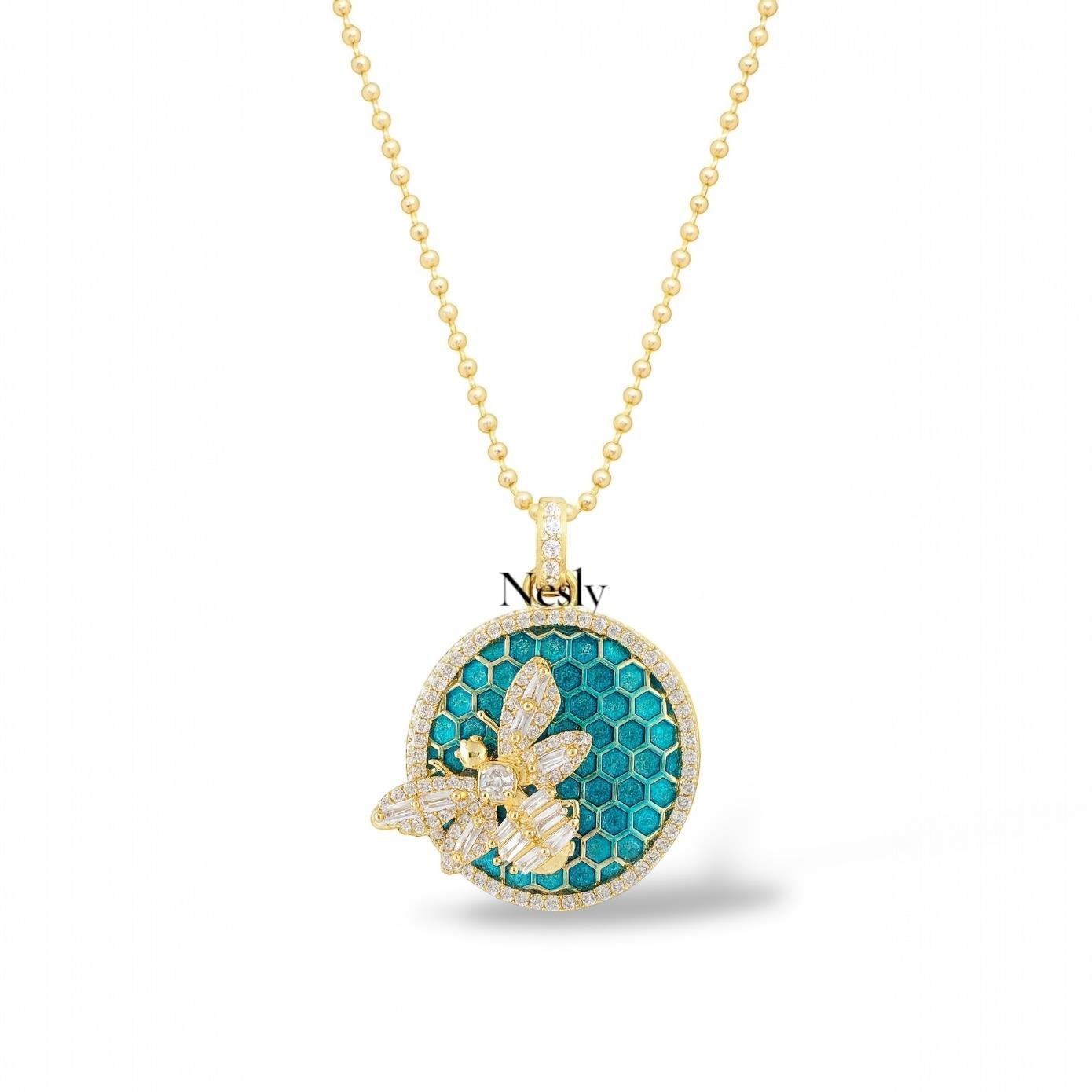 Bal peteği formunda zarif bir tasarım, turkuazın enerjik tonu ile birleşerek hem şıklığı hem de ruhsal dengeyi bir araya getiriyor. Yaklaşık 55 cm uzunluğundaki 4K topçuk zinciri, modern görünüme geleneksel bir dokunuş katıyor. Günlük kombinlerde zarif bir ışıltı, özel günlerde ise fark edilen bir detay sunuyor. Turkuazın huzur veren rengi, stiline tazelik ve canlılık katacak.