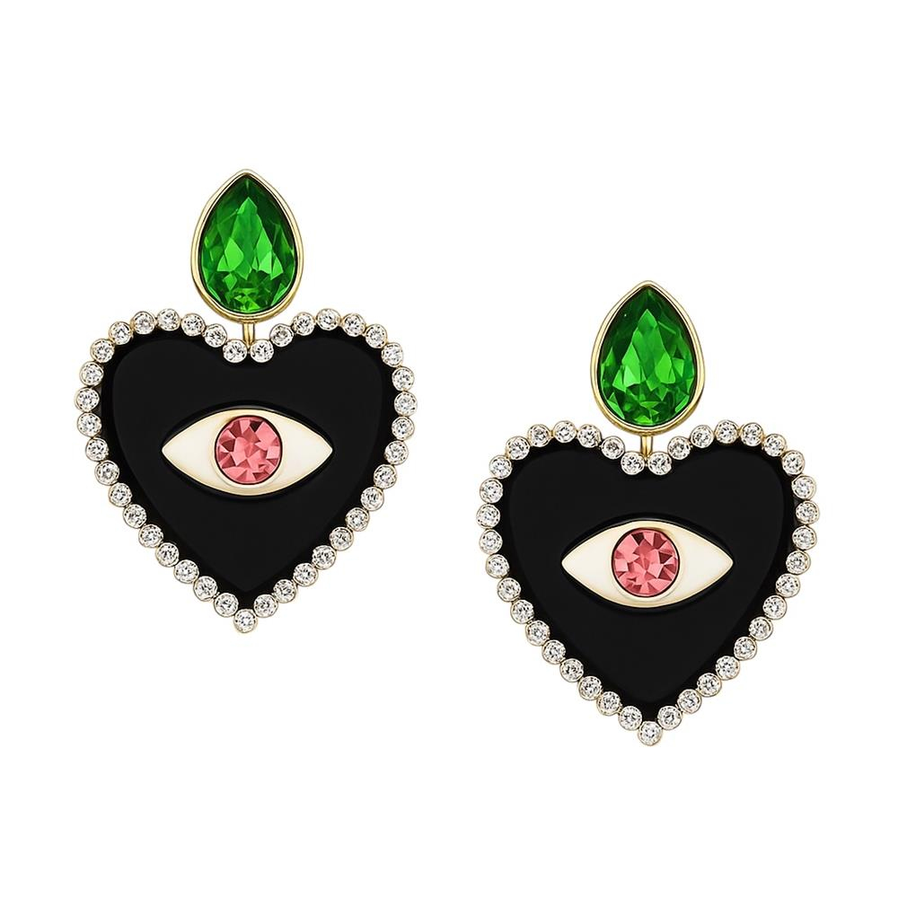 Siyah Kalp Renkli Taşlı Büyük Form Küpe